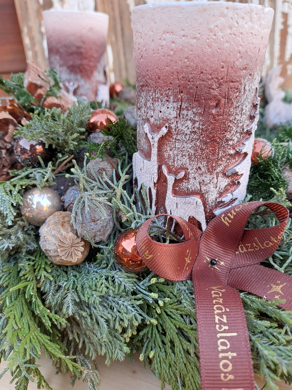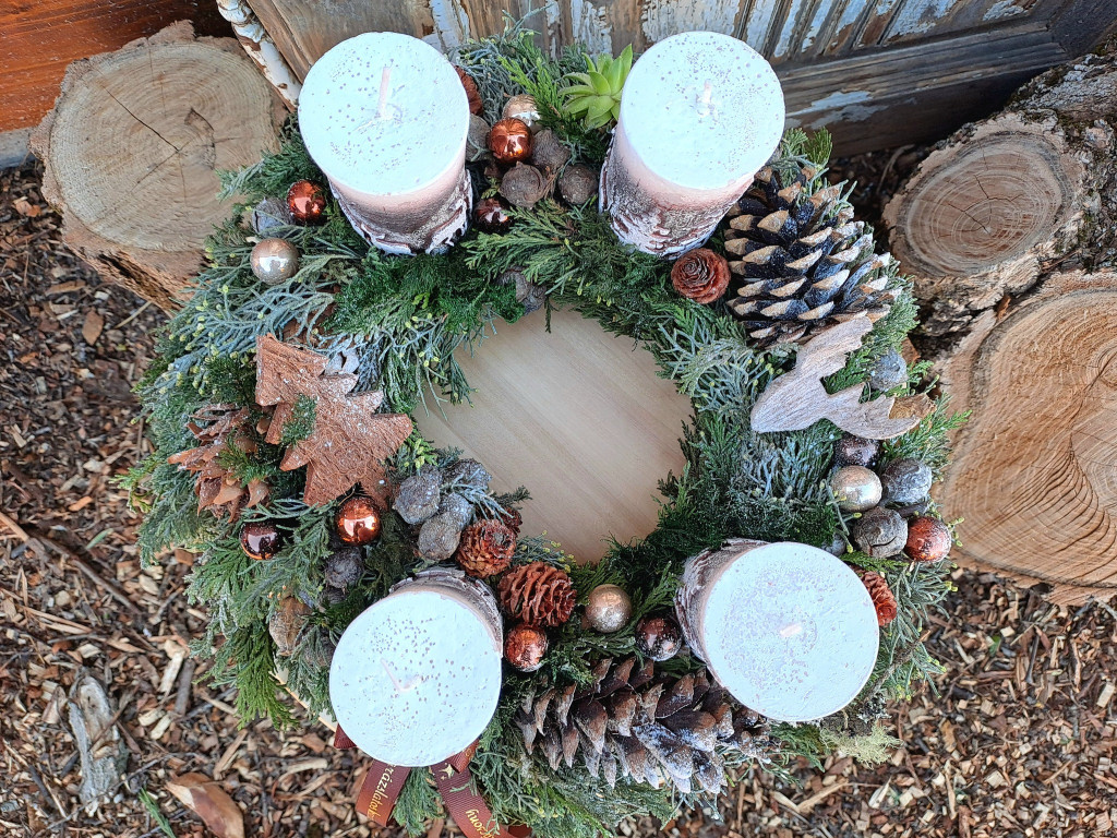 Természetesen kócos adventi koszorú őzekkel, fenyőfákkal.