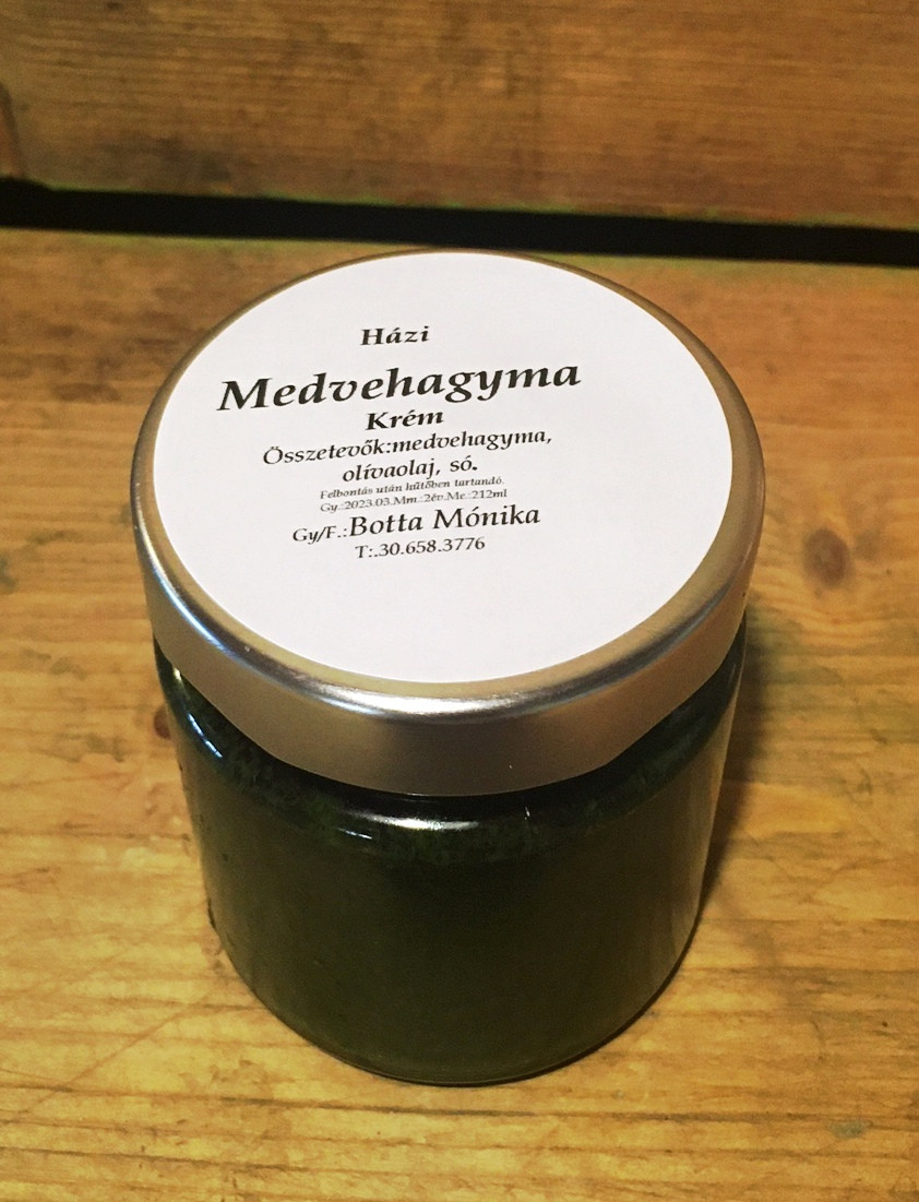 Összetevők: friss medvehagyma levél, olívaolaj, só. Krémes állagú. 2dl. Felhasználás: tészták, pogácsák, húsok ízesítésére, önmagában pirítós kenyérre, sajtok mellé. Visszaváltható üvegben:50.-Ft